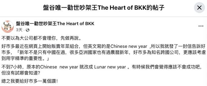 該事件緣起于一位名為“盤谷唯一勸世吵架王The Heart of BKK”的臺灣網紅,于12月13日在網絡上發帖表示,好市多最近在網頁上開始販賣年菜組合,但英文寫的是“Chinese New Year”,于是他決定發一封信告訴好市多,“新年不是只有中國在過,很多亞洲國家也有過農歷新年,好市多為知名跨國公司,更應該考慮到用字精準的重要性。”
