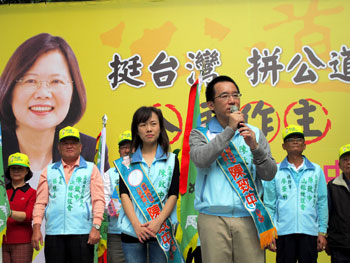 2012臺(tái)灣地區(qū)領(lǐng)導(dǎo)人選舉參選人蔡英文昨天在高雄市輔選時(shí),呼吁民眾集中選票支持民進(jìn)黨籍民代參選人郭玟成,在同一個(gè)選區(qū)參選的陳致中說(shuō),將繼續(xù)拚選舉。