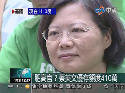馬英九批評民進(jìn)黨版18%(臺灣軍公教18%優(yōu)利存款)政策改革造成肥高官、瘦小吏,據(jù)藍(lán)營人士透露,民進(jìn)黨主席蔡英文優(yōu)存額度達(dá)410萬元(新臺幣,下同),換算年領(lǐng)優(yōu)惠利息73萬元,在民進(jìn)黨退休政務(wù)官員中,優(yōu)存額度最高,優(yōu)惠利息也最多,屬最肥高官。臺灣世新大學(xué)傳播所長游梓翔斷言,如果情況屬實(shí),蔡英文2012年就不必選臺灣地區(qū)領(lǐng)導(dǎo)人了。【詳細(xì)】