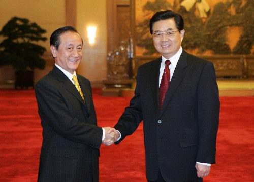 7月12日,中共中央總書記胡錦濤在北京人民大會堂會見新黨主席郁慕明率領的新黨紀念抗戰(zhàn)勝利60周年大陸訪問團一行。 新華社記者 馬占成 攝