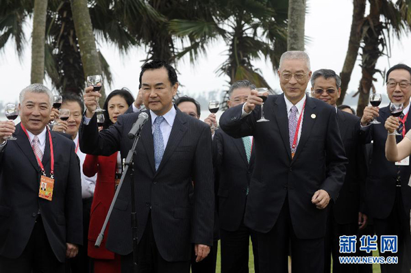 4月1日,中共中央臺辦、國務院臺辦主任王毅在海南博鰲舉行招待酒會,歡迎前來出席博鰲亞洲論壇的臺灣兩岸共同市場基金會名譽團長吳敦義一行。新華社記者金良快攝