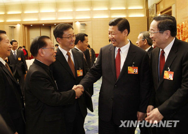 3月5日,中共中央政治局常委、國(guó)家副主席習(xí)近平來到他所在的十一屆全國(guó)人大三次會(huì)議上海代表團(tuán),同代表們一起審議政府工作報(bào)告。新華社記者劉建生攝