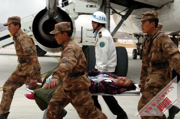 4月17日,一名地震危重傷員被解放軍戰(zhàn)士和機(jī)場急救人員抬往救災(zāi)飛機(jī)。新華社記者 郭剛 攝