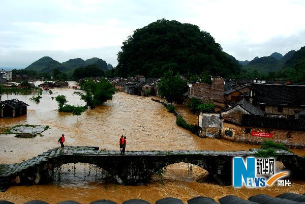 這是5月14日拍攝的發生洪澇災害的湖南省江永縣歷史名村上甘棠村。當日凌晨,湖南省永州市江永縣普降暴雨,暴雨引發的洪水造成江永縣千年古村上甘棠村發生洪澇災害,部分村民被洪水圍困。當地公安民警、消防官兵和預備役民兵迅速行動,把洪水圍困的村民轉移到安全地帶。上甘棠村是具有湘南建筑特色的歷史名村。新華社發(黃海 攝)