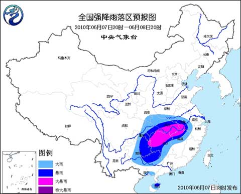預計,6月7日20時到6月8日20時,陜西東南部、河南南部、湖北、安徽中南部、江西北部、湖南大部、貴州大部、重慶大部、廣西北部和南部、海南中北部等地有大到暴雨,其中,貴州東北部、湖南北部、江西西北部、湖北南部、安徽西南部等地的部分地區有大暴雨。
