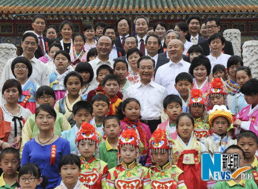 6月11日下午15時許,中南海紫光閣前,一群身著鮮艷民族服裝的中韓兩國少年兒童,歡呼雀躍地擁向國務院總理溫家寶,緊緊圍在他身邊。