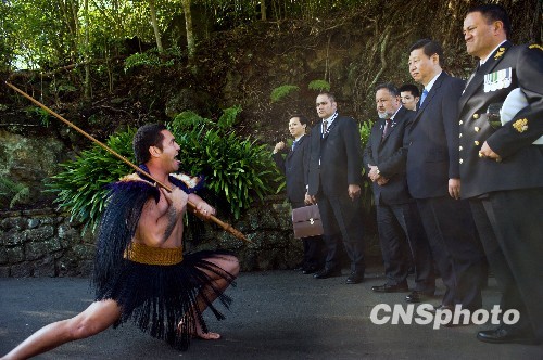 國家副主席習近平于當地時間6月17日抵達奧克蘭,開始對新西蘭進行正式訪問。圖為在奧克蘭總督府,新西蘭方以毛利人傳統儀式迎接習近平一行。 中新社發 胡旭君 攝