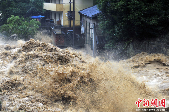 6月14日,福建南平西芹鎮(zhèn),山洪肆虐,涌向民房。這二日延平區(qū)降特大暴雨,強(qiáng)降雨導(dǎo)致延平、順昌等地多處出現(xiàn)山體滑坡、泥石流等地質(zhì)災(zāi)害。中新社發(fā) 柳濤 攝