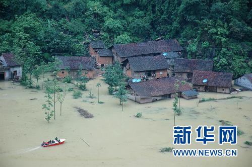 6月20日,受災嚴重的南丹縣立坳村完全被水浸泡。6月17日以來,廣西南丹縣八圩瑤族鄉境內普降大暴雨。災情發生后,鄉黨委、政府第一時間緊急轉移和安置受災群眾,確保群眾生活。南丹縣緊急調撥帳篷65頂、盒飯1200份、礦泉水100件、大米600斤、豬肉60斤、蔬菜200斤、食用油和食鹽等發放到受災群眾手中,并安排人員24小時值班,確保通信暢通。新華社記者 盧哲攝