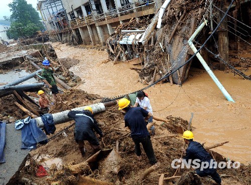 6月22日下午,福建南平市供排水部門的工作人員在該市延平區安豐路被洪水沖垮的路段搶修自來水供應管道。自6月13日以來,福建連續遭受特大暴雨襲擊,造成了歷史罕見的自然災害,截至21日16時初步統計因災死亡76人、失蹤79人,直接經濟總損失95.51億元人民幣。 中新社發 劉可耕 攝