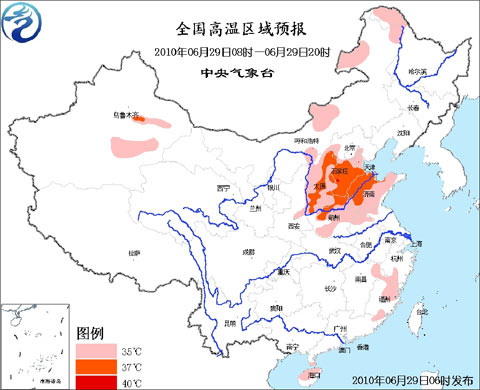 中央氣象臺29日06時繼續發布高溫藍色預警:預計,今天白天,內蒙古東北部和中部的部分地區、黑龍江西北部、山西大部、河北大部、天津、河南大部、山東大部、安徽北部、江蘇西北部、福建北部和南部的部分地區、江西東北部的部分地區、海南北部等地有35~37℃、部分地區38℃的高溫天氣,其中,河北南部的局部地區氣溫可達40℃。