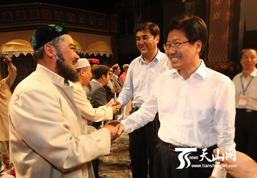 7月2日,自治區黨委書記張春賢,自治區黨委副書記、自治區主席努爾·白克力等領導在新疆藝術劇院話劇團觀看了三幕六場風情話劇《大巴扎》后,上臺與演員親切握手向他們表示祝賀。記者李楊攝