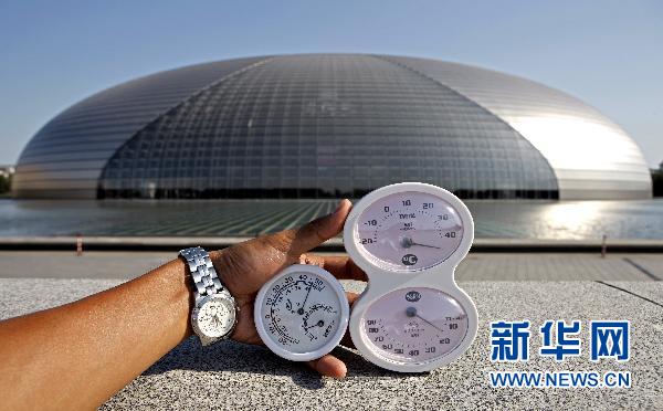 7月6日下午4時37分,在北京國家大劇院前,一支溫度計顯示氣溫超過45攝氏度(左),另一支溫度計則已無法顯示讀數。新華社記者 沈伯韓攝