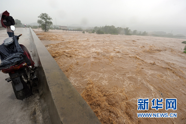 7月13日,山洪通過安徽池州齊石公路一處橋梁。當日,受強暴雨影響,安徽省池州市貴池區(qū)暴發(fā)山洪,多處道路被沖斷,山體滑坡,洪水蔓延,造成梅街、梅村、棠溪三個鄉(xiāng)鎮(zhèn)45個村的5萬多名群眾受困。武警官兵、民兵預備役人員和當?shù)馗扇阂讶ν度肟购閾岆U。目前,無人員傷亡報告。新華社記者 郭晨 攝