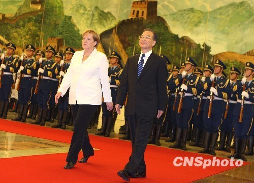 7月16日上午,中國國務(wù)院總理溫家寶在北京人民大會堂舉行儀式歡迎德國總理默克爾訪華。 中新社發(fā) 任晨鳴 攝