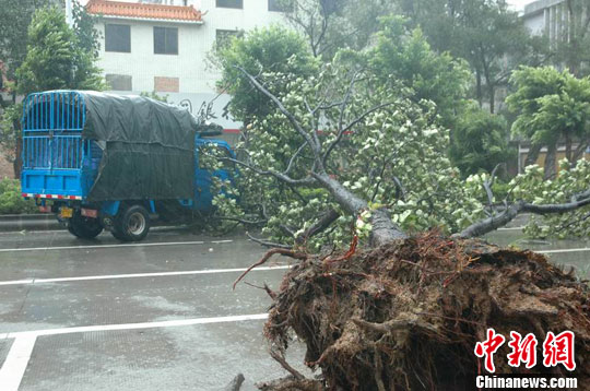 在南海兩次“實施”90度急轉彎的今年第3號臺風“燦都”,7月22日13時45分在粵西湛江吳川市吳陽鎮沿海地區登陸,中心最大風速每秒35米,最大風力12級。臺風帶來的極強破壞力,吳川附近地區茂名市等亦受影響,當地曾一度停水停電。臺風將市區路邊的樹木被連根拔掉。中新社發