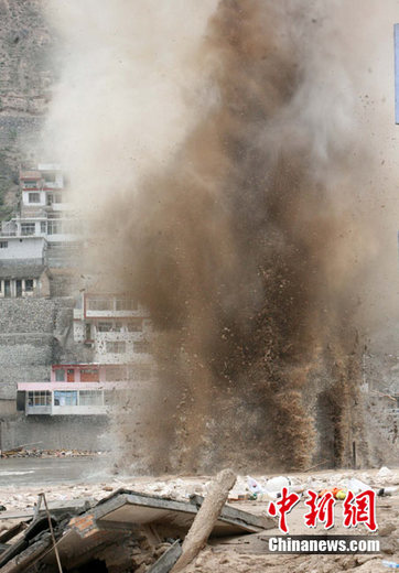 8月10日,蘭州軍區(qū)某集團(tuán)軍“開山斧工兵團(tuán)”兩次對舟曲災(zāi)區(qū)堰塞湖實施爆破,雖然通過爆破,使河道基本疏通,但效果還不太明顯。11日,蘭州軍區(qū)工兵連將繼續(xù)爆破,使用炸藥重量也將提高。中新社發(fā) 劉忠俊 攝