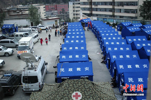 8月10日晚,設(shè)在甘肅舟曲三中的受災(zāi)民眾安置點內(nèi)架起很多救災(zāi)帳篷,家園被毀人們的生活在這里得以繼續(xù)。據(jù)民政部網(wǎng)站消息,截至8月10日16時,民政部從中央救災(zāi)物資儲備庫調(diào)運的物資中已有5000張折疊床和5000條睡袋運抵舟曲災(zāi)區(qū),其余5000頂12平方米單帳篷、200頂36平方米大帳篷、2萬件棉大衣、3000張折疊床預(yù)計10日夜間運抵。中新社發(fā) 楊鴻 攝