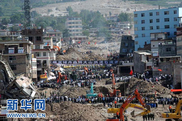 8月15日,人們在舟曲泥石流災害現場舉行哀悼活動。當日上午10時,舟曲特大山洪泥石流災害哀悼活動在舟曲縣城關鎮東街村泥石流災害發生現場舉行。 新華社記者 聶建江 攝