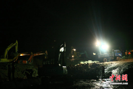 8月14日凌晨,汶川境內映秀鎮、漩口鎮、銀杏鄉、三江鄉等鄉鎮發生多處泥石流災害,泥石流阻斷道路、沖毀房屋,泥石流沖出物致使120米寬的岷江河道淤塞,堰塞體平均高度達7米,致使岷江改道。圖為工程人員正在連夜處置堰塞體。中新社發 張浪 攝