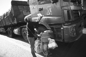 昨日,京藏高速東洋河收費站附近,當?shù)厝擞巫咴谲囕v中間販賣商品。京藏高速大堵車昨日進入第9天,擁堵情況有所緩解,以前最擁堵的內(nèi)蒙古興和至河北東洋河段,車輛經(jīng)過時間由3天縮減至1天。記者發(fā)現(xiàn),擁堵車輛大多為煤車,煤車司機稱如繞行需要經(jīng)過煤檢站,可能要交罰款,還要多交高速費,所以寧堵不繞行。 王申 攝