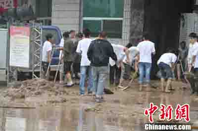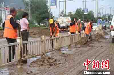 呂梁市區發生暴雨襲擊后,環衛工人在清理街道淤泥。高增平 攝