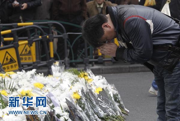 11月23日,一位市民在事發(fā)大樓外向遇難者致哀。新華社記者 裴鑫 攝