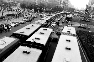 2010年7月21日下午,中關(guān)村海淀黃莊路口北,進(jìn)站的公交車排起長隊(duì),好像一列“公交列車”。李飛 攝