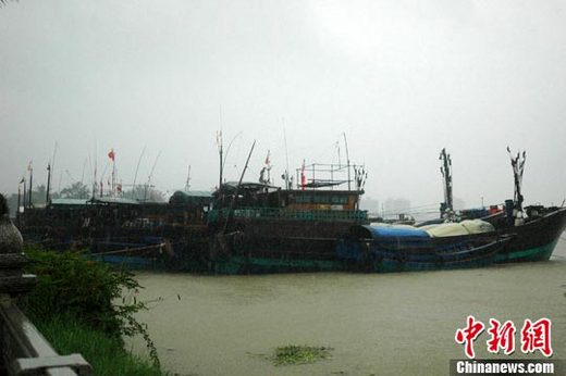 資料圖:圖為強(qiáng)降雨來襲前,在海口海甸溪內(nèi)回港避險的漁船。王辛莉 攝