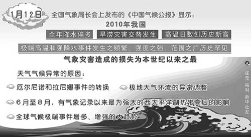 1月12日,中國氣象局發布《2010年中國氣候公報》。公報顯示,2010年我國極端高溫和強降水事件發生之頻繁、強度之強、范圍之廣歷史罕見,是本世紀以來我國氣候最異常的一年。