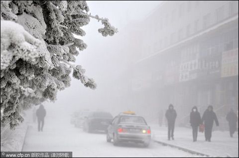 嚴(yán)寒低溫導(dǎo)致呼倫貝爾全市出現(xiàn)冰霧,能見度差,地上樹上全是冰,人們出行受到很大影響。在家住牙克石市的許女士看來,似乎整個(gè)城市也如同人們感受的寒冷一樣,被“速凍”了。“大街上人少了許多,人們盡可能在晚上不出門。路面上被車尾氣化開的積雪,大都積成厚厚的冰層,人們?cè)诒闲凶邥r(shí),步步都要小心!痹S女士說。這樣的冰霧天氣一直持續(xù)到17日才有所好轉(zhuǎn)。