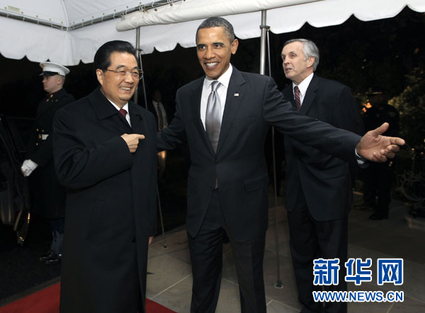 1月18日,國家主席胡錦濤出席美國總統奧巴馬在白宮舉行的私人晚宴。這是胡錦濤主席抵達時,受到奧巴馬總統的熱情迎接。 新華社發