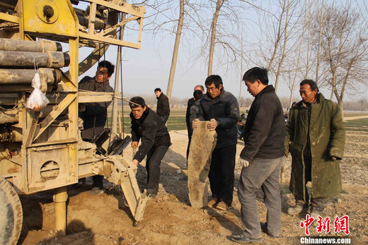 面對(duì)嚴(yán)重旱情,山東各地積極實(shí)施河道清淤,加強(qiáng)水庫(kù)蓄水、鉆打儲(chǔ)水機(jī)井等農(nóng)村水利基礎(chǔ)設(shè)施建設(shè),為保春灌奠定基礎(chǔ)。圖為山東省成武縣抗旱打井服務(wù)隊(duì)正在地頭打井,為實(shí)現(xiàn)“以河補(bǔ)源、以井保豐”奠定基礎(chǔ)。楊東亮 攝