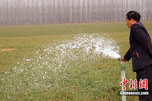 2011年2月上旬,中國小麥主產區河南省南陽市的農民在積極抗旱澆麥。中新社記者 劉萬強 攝