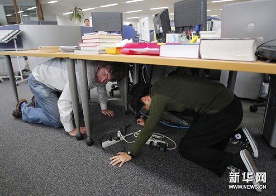 3月11日,在美聯(lián)社日本東京分部,記者們躲在桌下避震。新華社/美聯(lián)