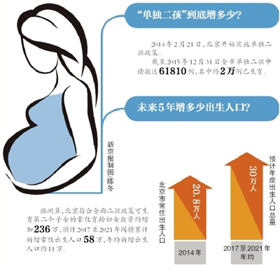 此前,2014年2月,北京市曾實施單獨二孩政策。根據市衛計委統計數據,截至2015年12月31日全市單獨二孩申請數達61810例,其中約2萬例已生育。如果根據申請數推算,仍有約4萬例需要釋放。加上“全面二孩”加碼的生育數量,未來,北京市新生兒是否會面臨“井噴式”增長?