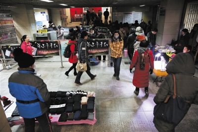 1月6日,國貿(mào)站通往銀泰商場的通道,兩旁的攤位使通道縮窄一半。