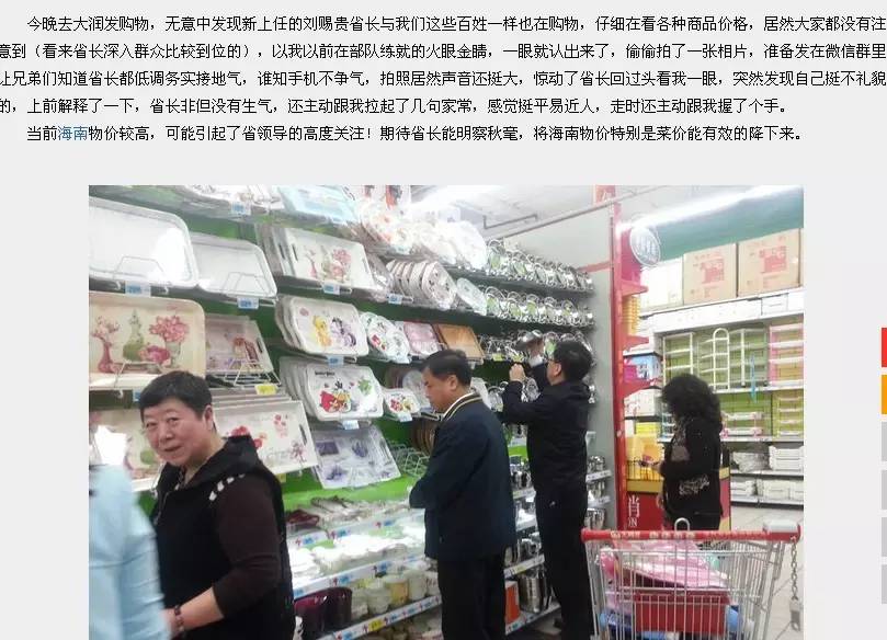 在超市里被偶遇的不止李小鵬。政知圈(微信ID:wepolitics)偶然發現,有網友去年1月份在天涯上發帖,稱在大潤發偶遇了劉賜貴。