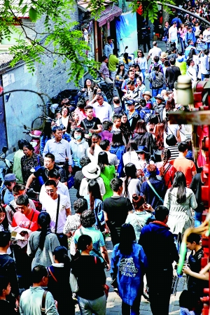 據統計,目前南鑼鼓巷日均客流量超過3萬人次,周末客流量超過5萬人次,節假日客流量超過了10萬人次。而按照國家旅游局此前公布的《景區最大承載量核定導則》標準,南鑼鼓巷景區的瞬時承載量僅為1.7萬人。