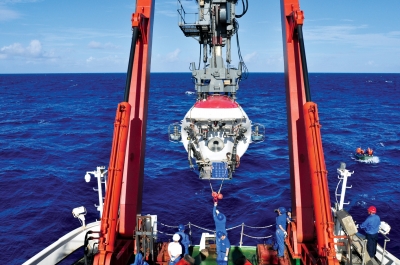 水面支持系統操作人員在布放“蛟龍”號載人潛水器。