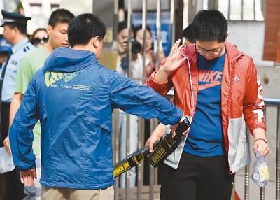 “這是我參加監考這么多年來,最嚴格的一次高考監考!痹诮髂喜校幻O考老師表示。每個考場門口,都有監考老師拿著金屬檢測儀對考生進行一絲不茍的安檢,從上到下、從前到后,身上的每一處都要用檢測儀掃描一遍。除了準考證和身份證,一支筆芯、一片紙片都不能帶進考場。