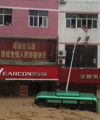 7月11日下午,福建省閩清縣坂東鎮遭洪水襲擊。滔滔的洪水當中,只見一輛中巴車自坂東街的洪水上游漂了過來,卡在了對面街邊電線桿上,車上有一男一女兩個人在呼救。