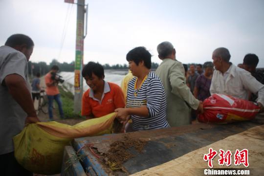 饒陽縣村民自發組織裝填沙土、背運沙袋護衛堤防。