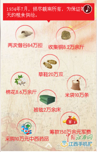 眾所周知,1934年7月,為保證紅軍二萬五千里長征路上每人7天的糧食供給,贛南傾盡所有貢獻:籌集150萬余元軍費、84萬擔谷物、20萬雙草鞋、采購10萬元中西藥品、10萬袋大米、8.6萬余斤棉花、8.2萬余斤銅、2萬余床被毯等,贛鄱兒女們?yōu)橹袊锩龀隽司薮鬆奚头瞰I。