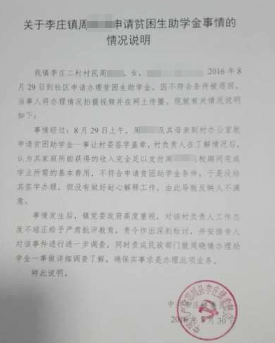 當時李莊鎮李莊二村村民周某某(女)及其母親,到村辦公室就申請辦理貧困生助學金一事,讓村委簽字蓋章,村負 責人在了解情況后,認為其家庭所獲得的收入完全足以支付周某某在校期間完成學業所需的基本費用,不符合申請貧困助學金條件,于是沒有給其簽字辦理,但沒有 做好耐心解釋工作,由此導致反映人不滿意。