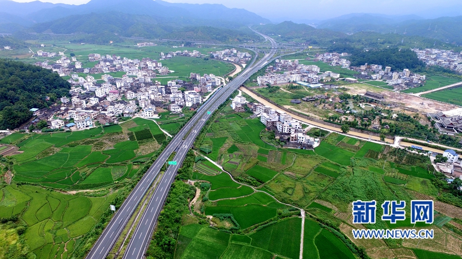 新泉鎮隸屬福建省連城縣管轄,是閩、粵、贛三省的交通要沖。圖為美麗的田園風光與高速公路相映成趣。