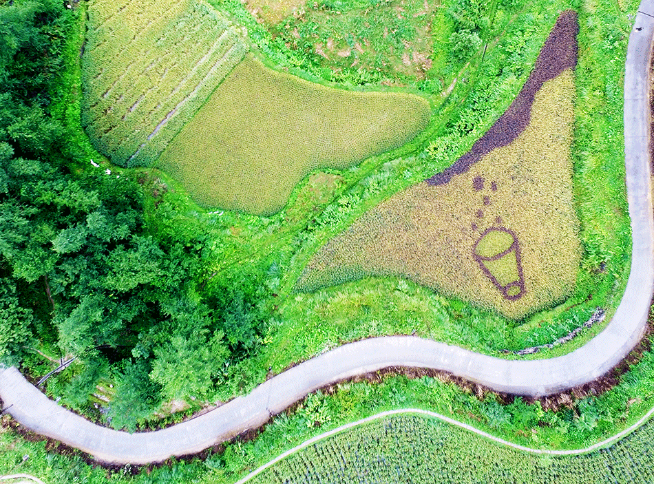 十八洞村村民在村口稻田“繪制”出一杯熱茶,歡迎來到十八洞村的客人 新華網(wǎng) 王超攝