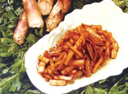 杭州《四時(shí)習(xí)俗》一書中記載說:“普通菜蔬均喜用筍。春夏之交食春筍,夏秋食邊筍……十月以后食冬筍,各種葷菜亦加筍為配料,可謂無日不筍,無食不筍。”“油燜春筍”選用杭州近郊清明節(jié)前出土的嫩筍,以重油、重糖烹制,色澤紅亮,鮮嫩爽口,略帶甜味,百吃不厭,是頗受廣大食者歡迎的一道傳統(tǒng)風(fēng)味菜。這道菜1956 年被浙江省認(rèn)定為36 道杭州名菜之一。