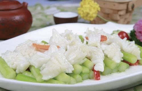 爆墨魚花是溫州的一道名菜。溫州人以墨魚作原料,能制作很多菜肴,以爆墨魚花最有特色。墨魚肉鍥花刀,燒熟后片片墨魚卷曲成麥穗狀,造型美觀。爆墨魚花是一種刀工、火候并重的名肴。色澤潔白,脆嫩爽口,鮮香味美。