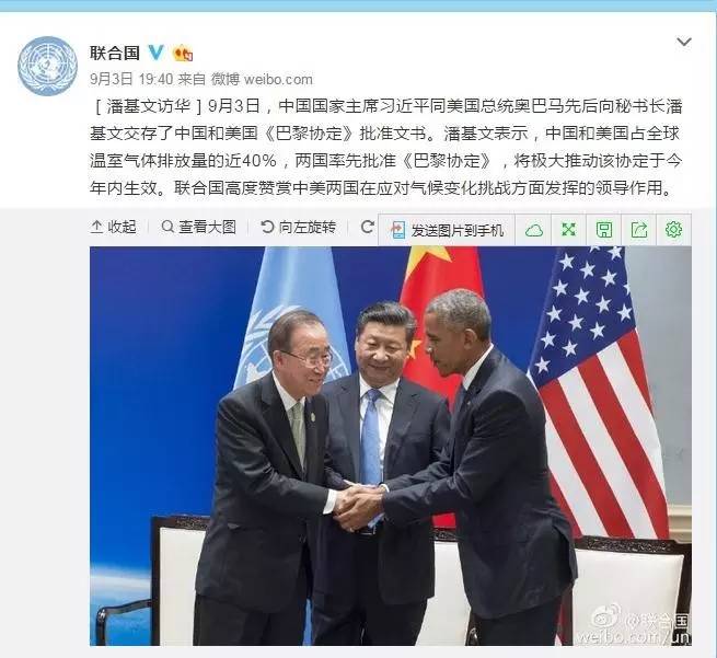 《巴黎協定》批準文書交存儀式后,@聯合國 官方微博也特意發了兩條微博,為中美兩國的表率之舉點贊!